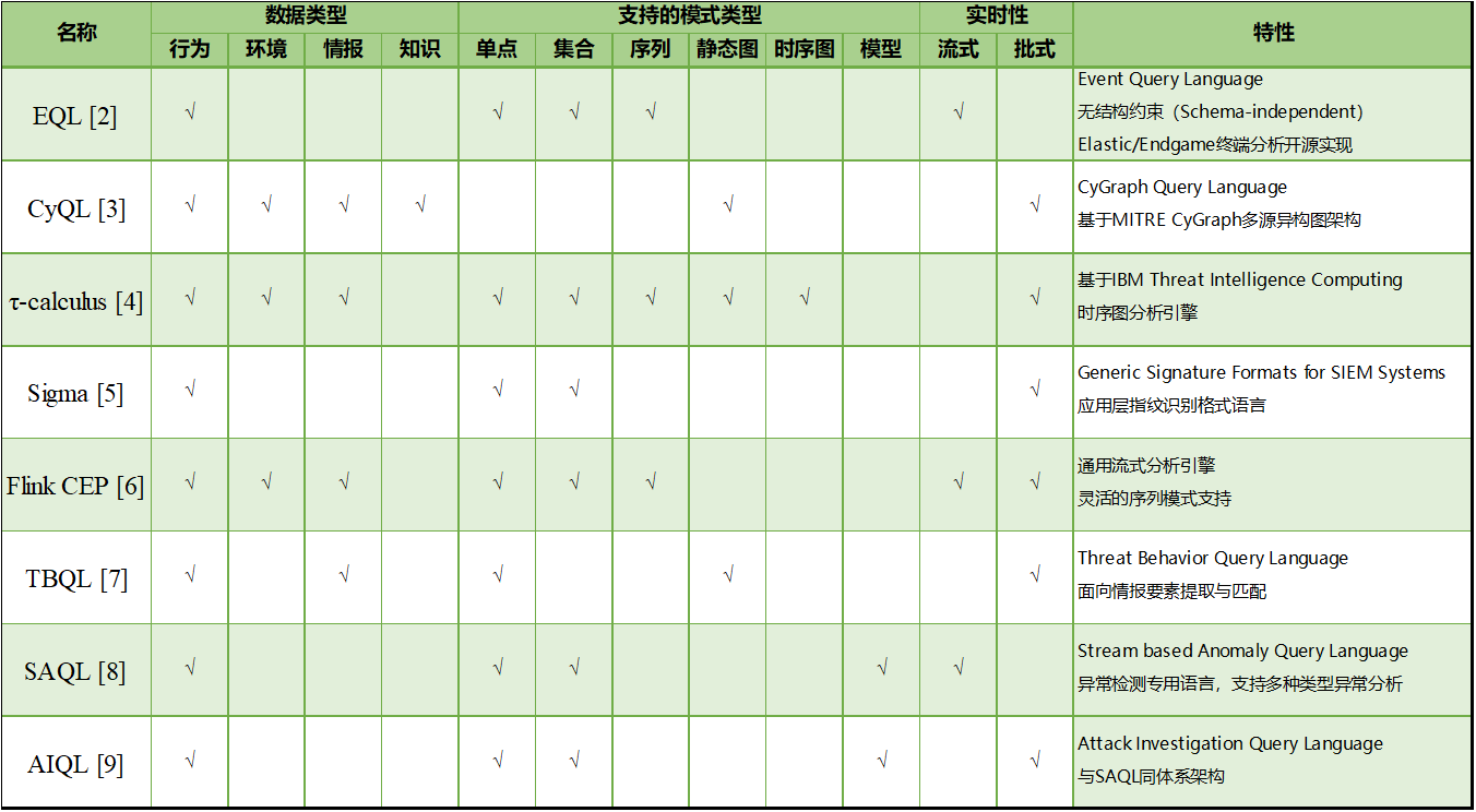 Èç±í1Ëùʾ£¬ÎÒÃÇÖ÷Òª´Ó¸ÃÓïÑÔÄ£×ÓÕë¶ÔµÄÊý¾ÝÀàÐÍ¡¢Ö§³ÖµÄģʽÀàÐÍ¡¢ÊµÊ±ÐÔÈý¸ö½Ç¶ÈÀ´ÆðÔ´±ê¶¨¸÷ÊÖÒռƻ®Ö÷ÒªµÄÓ¦ÓÃÁìÓòÓë·½·¨¡£Êý¾ÝÀàÐÍ·½Ã棬ÐÐΪ¡¢ÇéÐΡ¢Ç鱨¡¢ÖªÊ¶ËÄÖÖÀàÐ͵ÄÊý¾Ý¿ÉÁýÕÖÇå¾²ÔËÓªÖÐÐÄËù½ÓÈëµÄ²î±ðÀàÐÍÊý¾Ý¡£ÔÚģʽÀàÐÍÖУ¬“µ¥µã”Ö¸µÄÊÇÒÔÌØÕ÷»òÖ¸ÎÆÆ¥ÅäΪÖ÷µÄµ¥¸öÊÂÎñģʽ£»“ÜöÝÍ”ÌåÏÖ¶à¸öÊÂÎñµÄÎÞÐò×éºÏ£»“ÐòÁДÌåÏÖÓÐÐòµÄÊÂÎñ×éºÏ£»“¾²Ì¬Í¼”ÌåÏÖÐÅÏ¢Á÷»ò½á¹¹Ïà¹ØµÄÊÂÎñ×éºÏ£»“ʱÐòͼ”ÌåÏÖÓÐÐò²¢ÇÒ±£´æÐÅÏ¢¹ØÁªµÄÊÂÎñ×éºÏ£»“Ä£×Ó”ÌåÏÖ»ùÓÚ»úеѧϰµÈÄ£×ÓÒªÁ죬ÔÚͳ¼ÆÌØÕ÷ÉϿɹØÁªÆðÀ´µÄÊÂÎñ×éºÏ¡£ÊµÊ±ÐÔ·½Ã棬Ö÷Òª°üÀ¨Á÷ʽµÄÆÊÎöģʽºÍÅúÁ¿µÄÊÓ²ìģʽ¡£